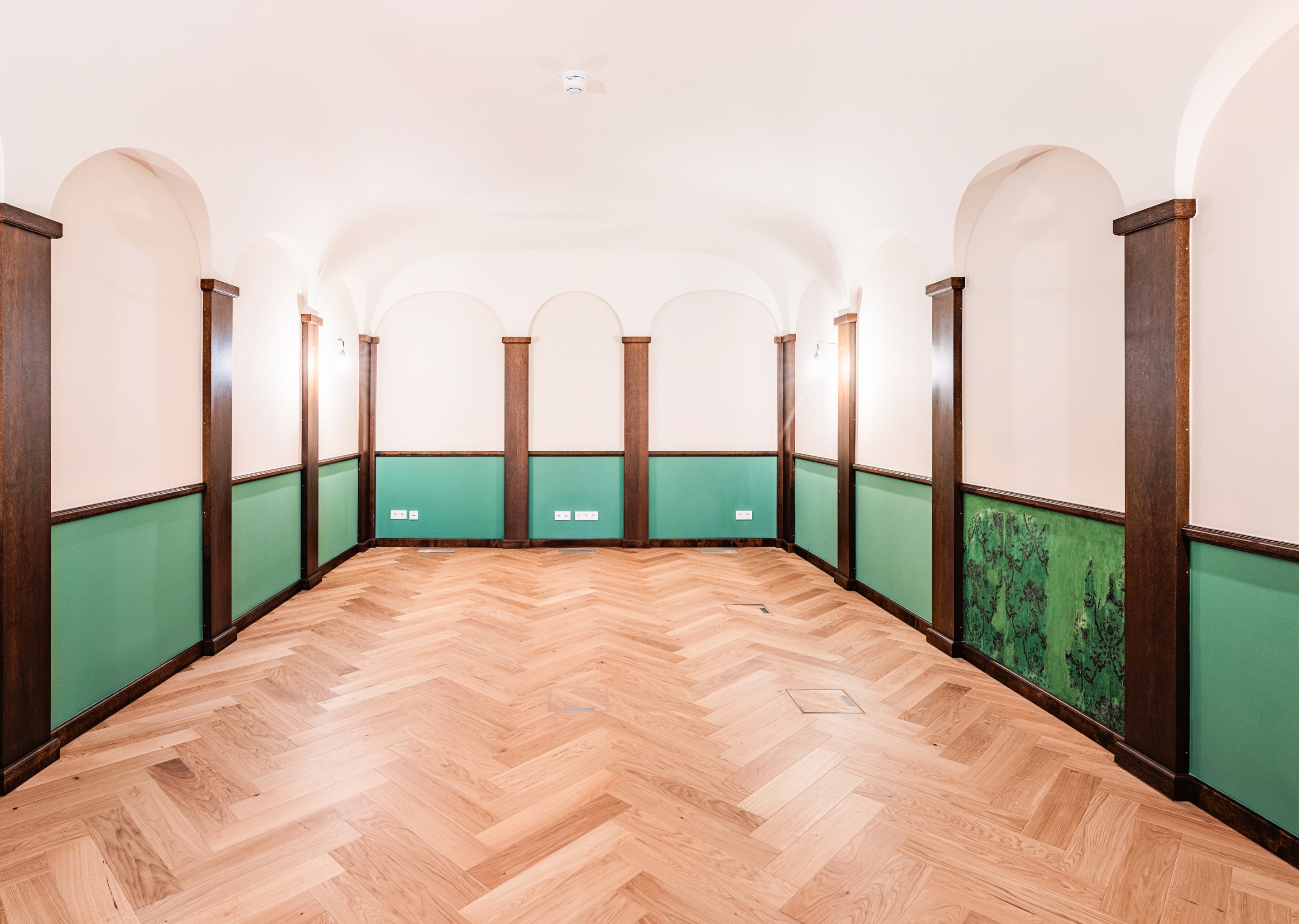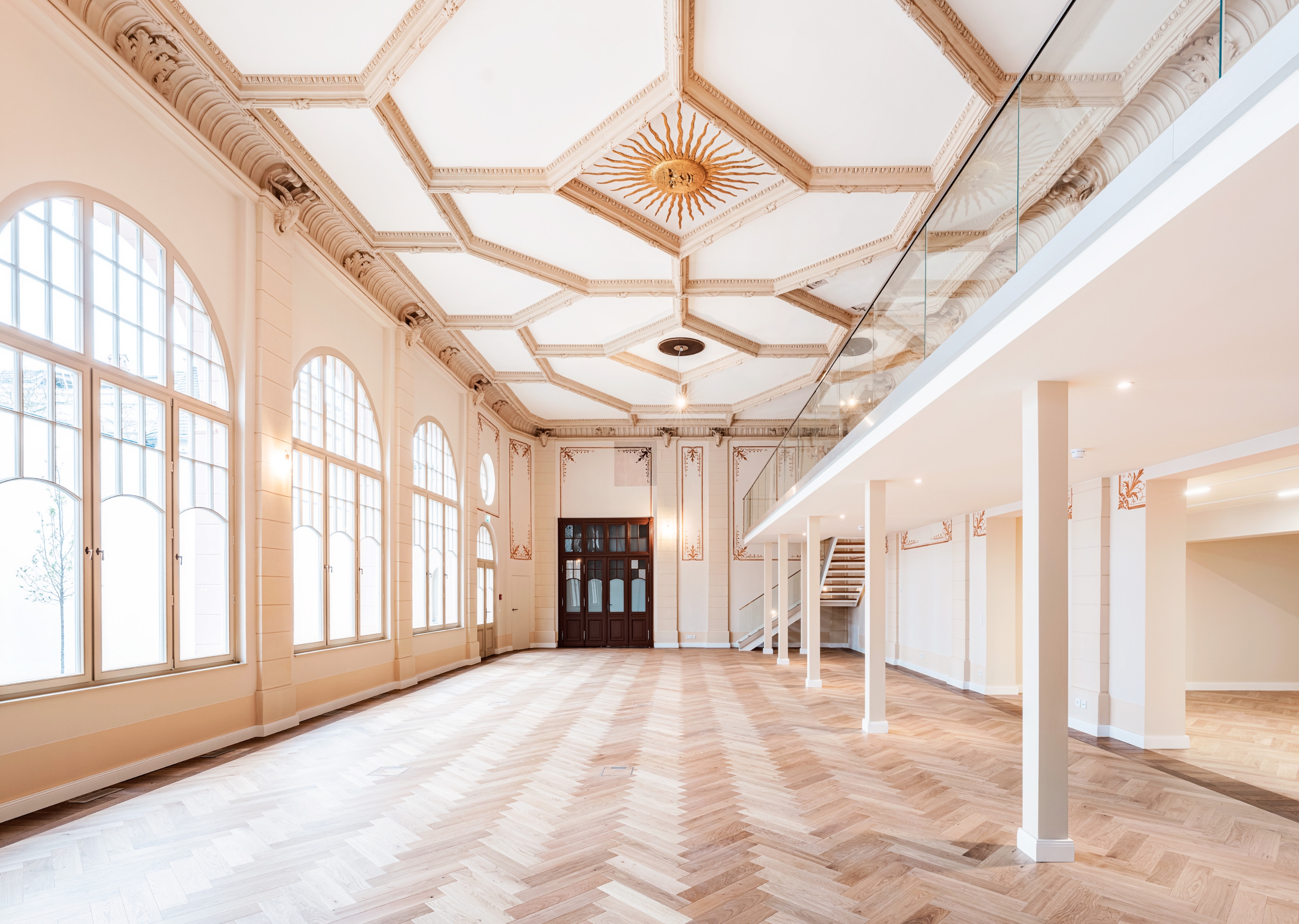Der neobarocke Tanzsaal ist das restauratorische Herzstück des Ensembles. Um seine historische Ausstrahlung zu bewahren, wurden Klima- und Elektrotechnik dezent in einem 1,20 Meter hohen Bodenaufbau verborgen – ein innovativer Ansatz in der Denkmalpflege, der zeitgemäßen Komfort unsichtbar macht.