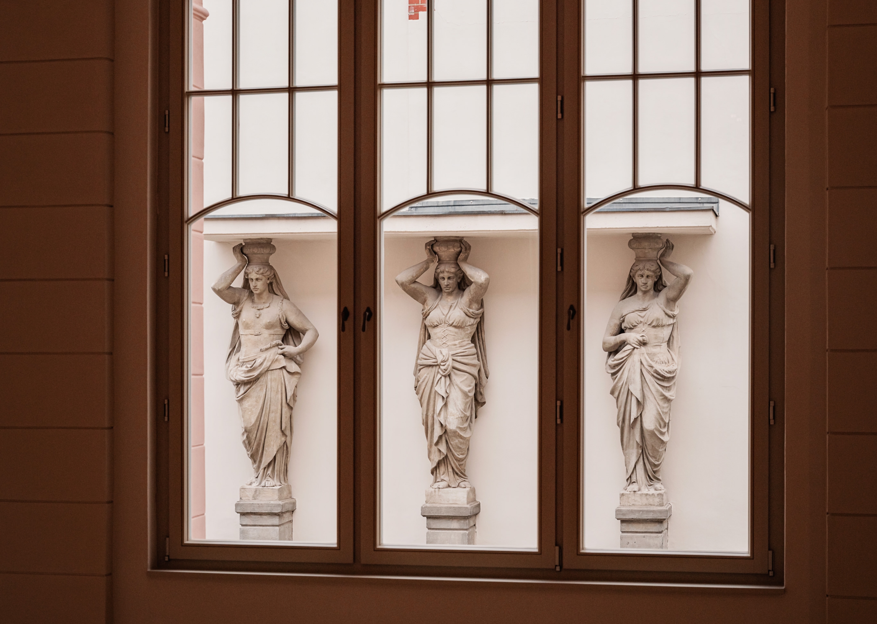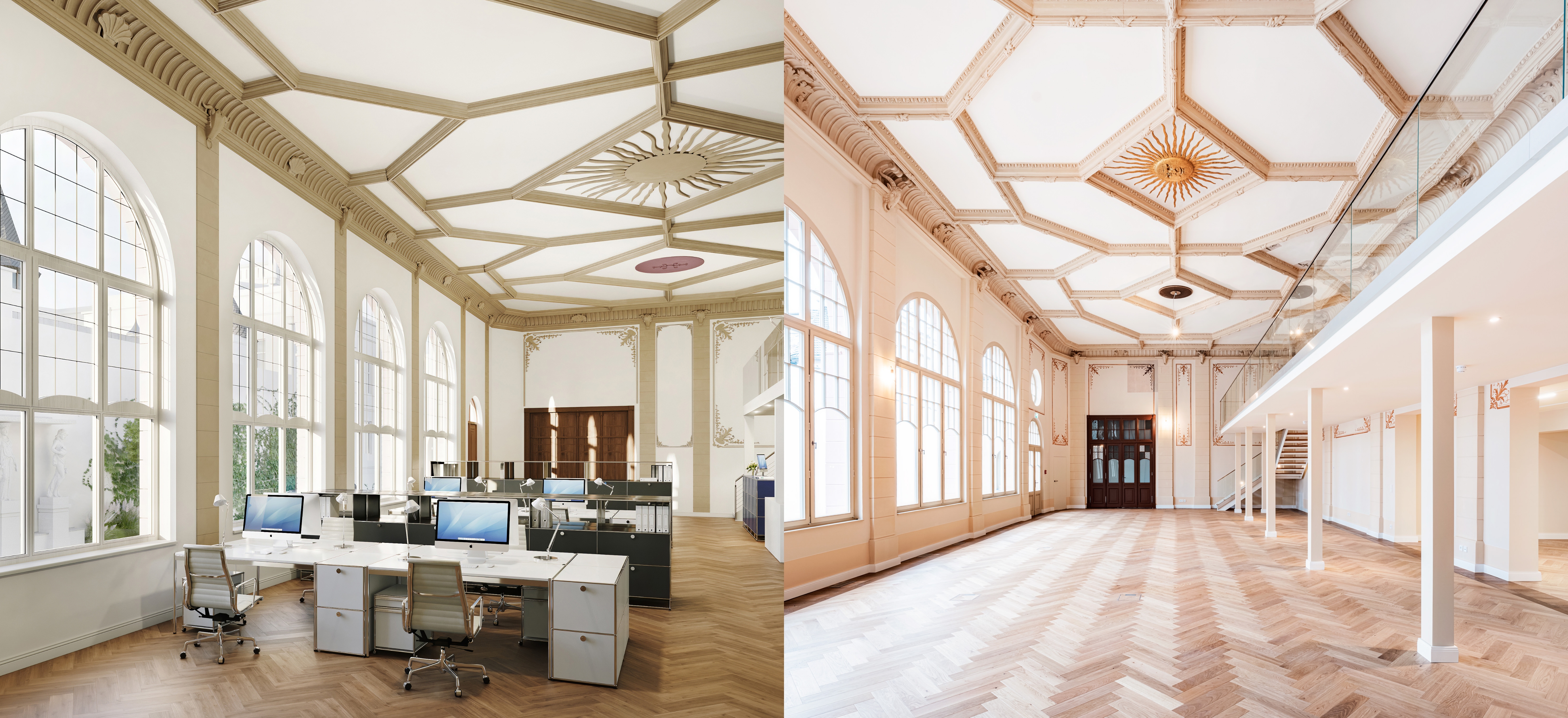 Die Sanierung hat die historische Schönheit des Hauses zurückgebracht – mit originalen Farben, feinem Stuck und reicher Ornamentik. Löwenköpfe zieren wieder die Fassade, Karyatiden verleihen ihr eine fast museale Anmutung. Und im ehemaligen Ballsaal geht die strahlende Sonne niemals unter …