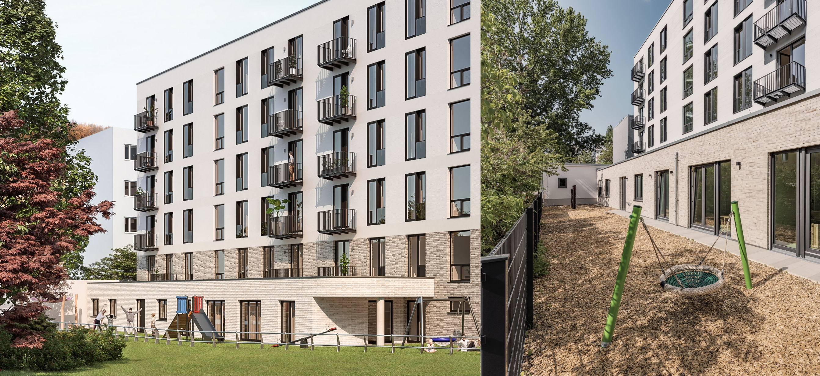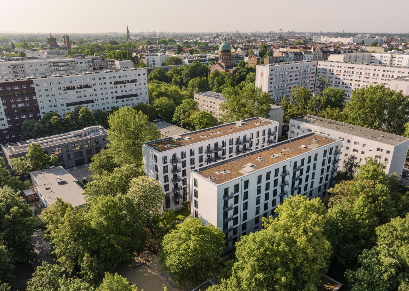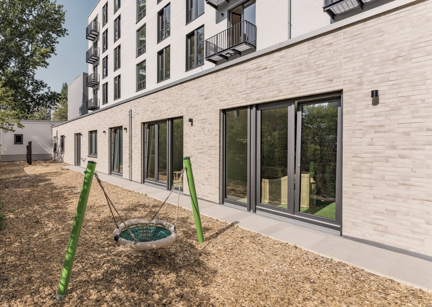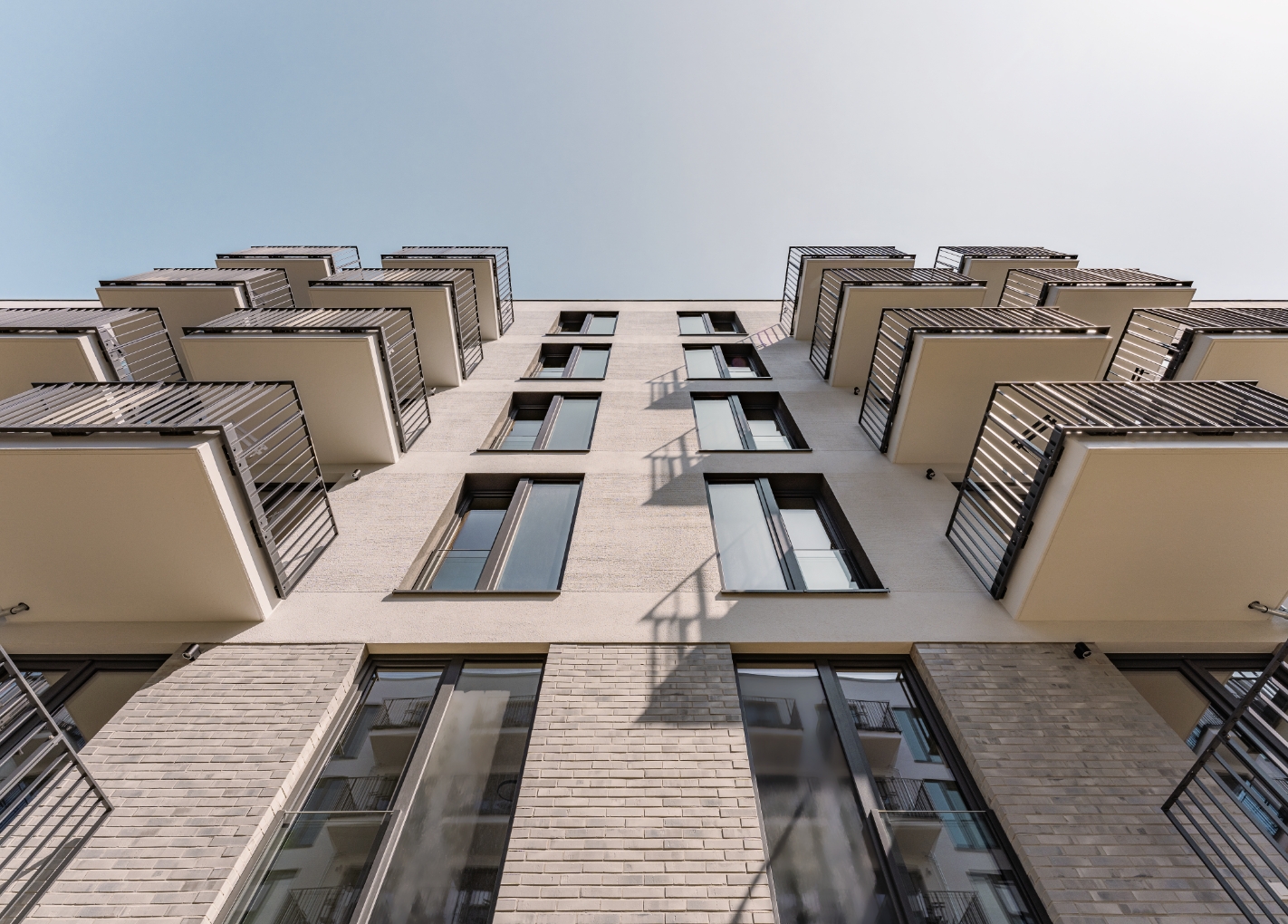 Entworfen wurde das Ensemble von BONANNI Architekten in klarer, moderner Fassadensprache. Die anthrazitfarbenen Fenster und die Stahlbalkone setzen einen farblichen Akzent zur sandfarbenen Fassade und ihrem Klinkerriemchensockel. Eine hochwertige Materialwahl und Präzision in der Ausführung zeichnen das Ensemble des renommierten Berliner Architekturbüros aus.