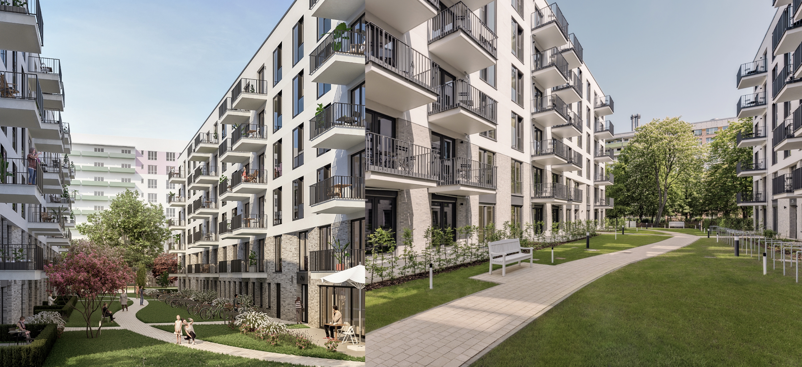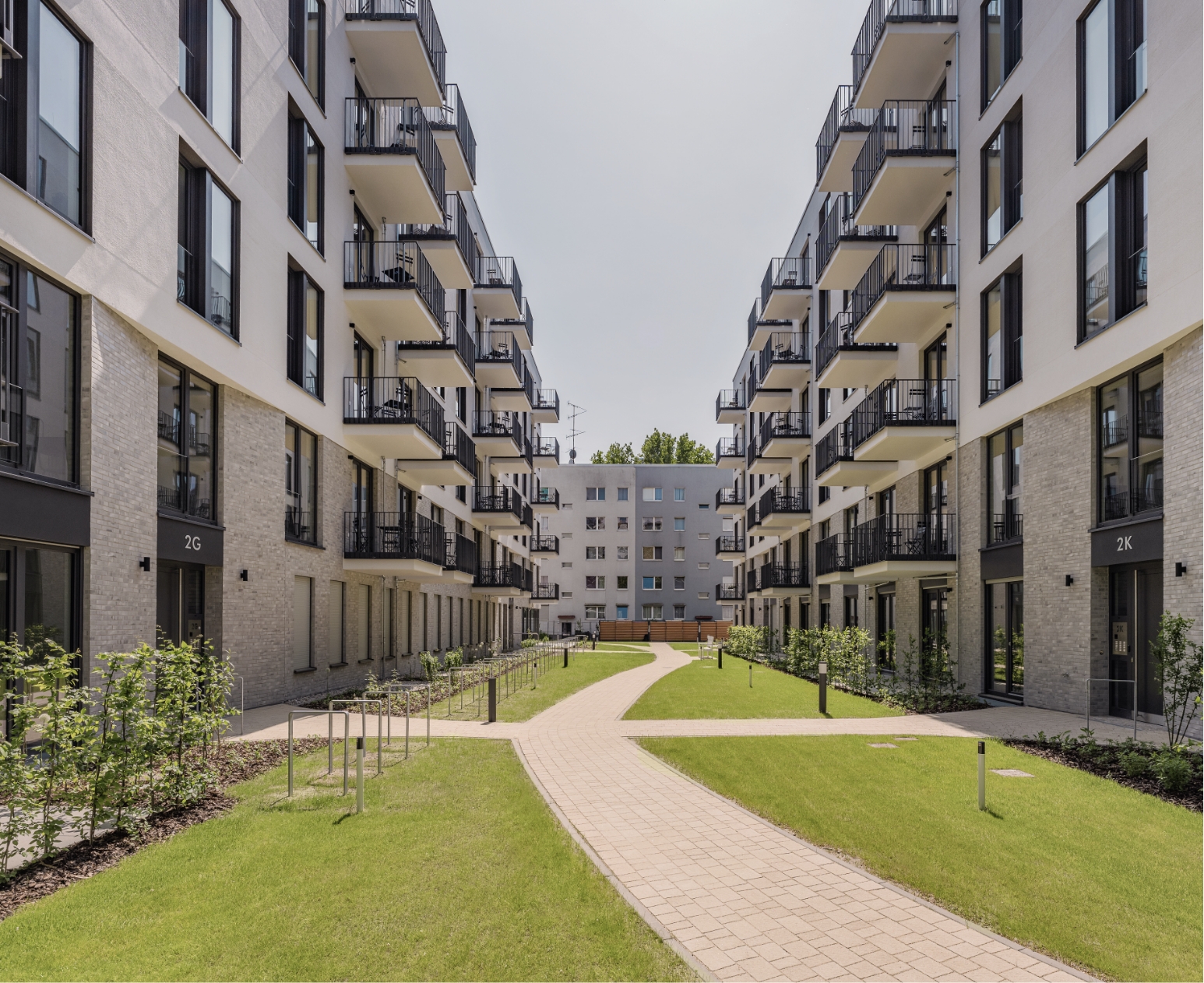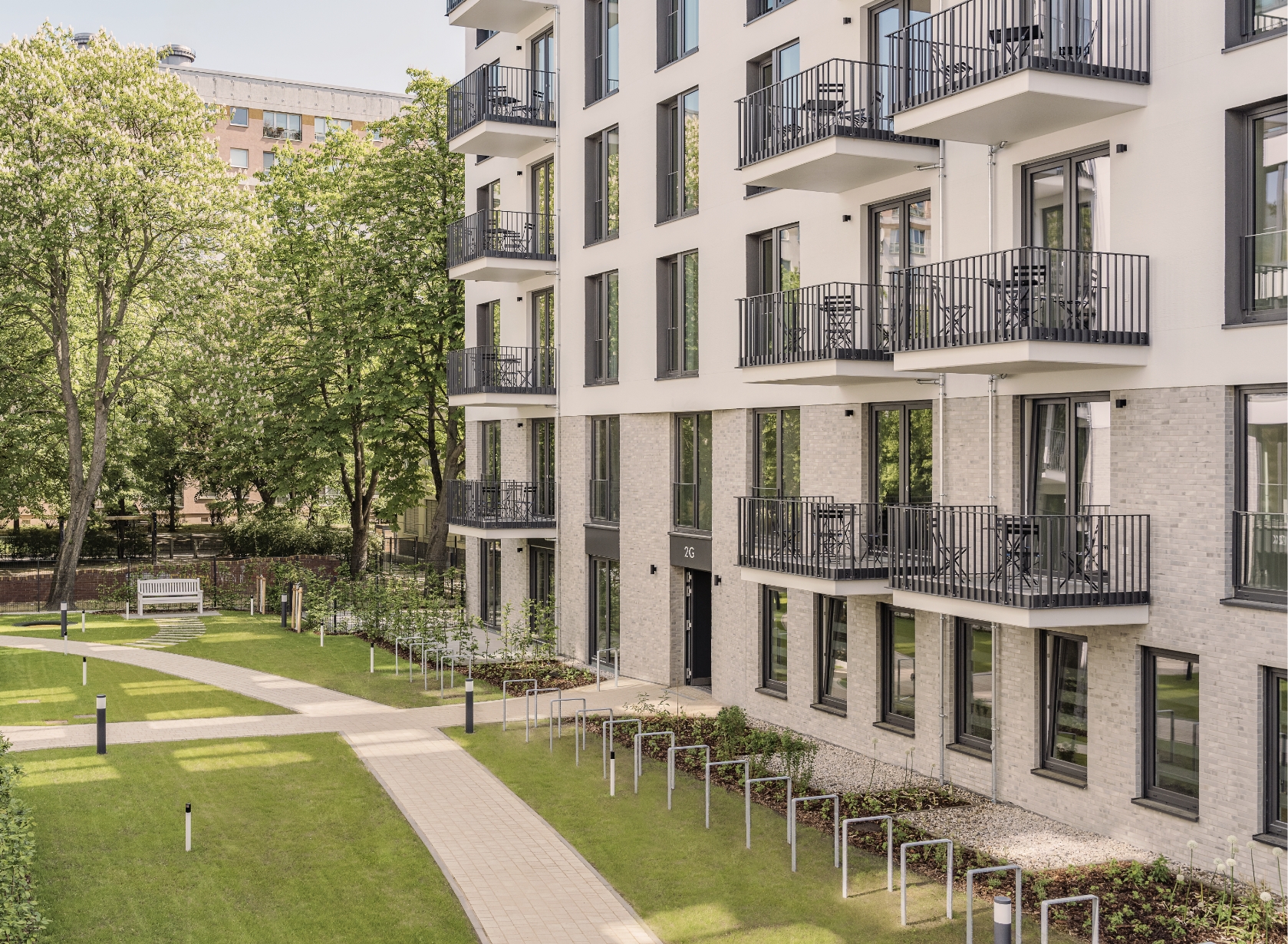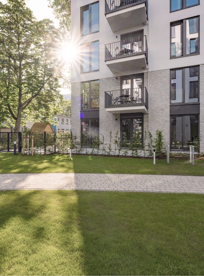 Durchatmen und die Seele baumeln lassen – das kann man nicht nur auf dem eigenen Balkon oder auf den Gartenterrassen der Erdgeschosswohnungen, sondern auch im grünen, stilvoll gestalteten Innenhof. Mit seinen Wegen, Beeten und Bänken eine schöne Kulisse, um dem Berliner Alltag eine Verschnaufpause zu gönnen.